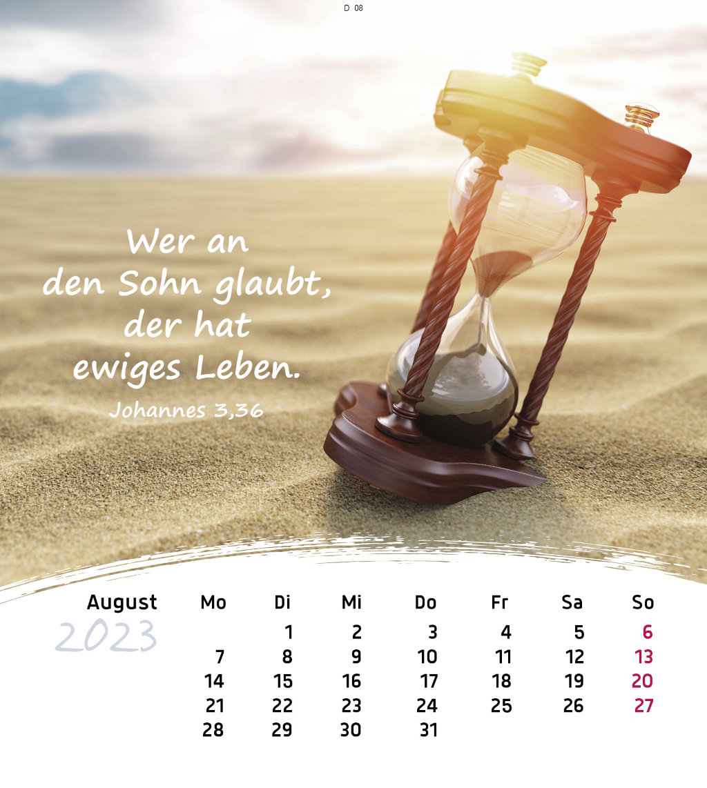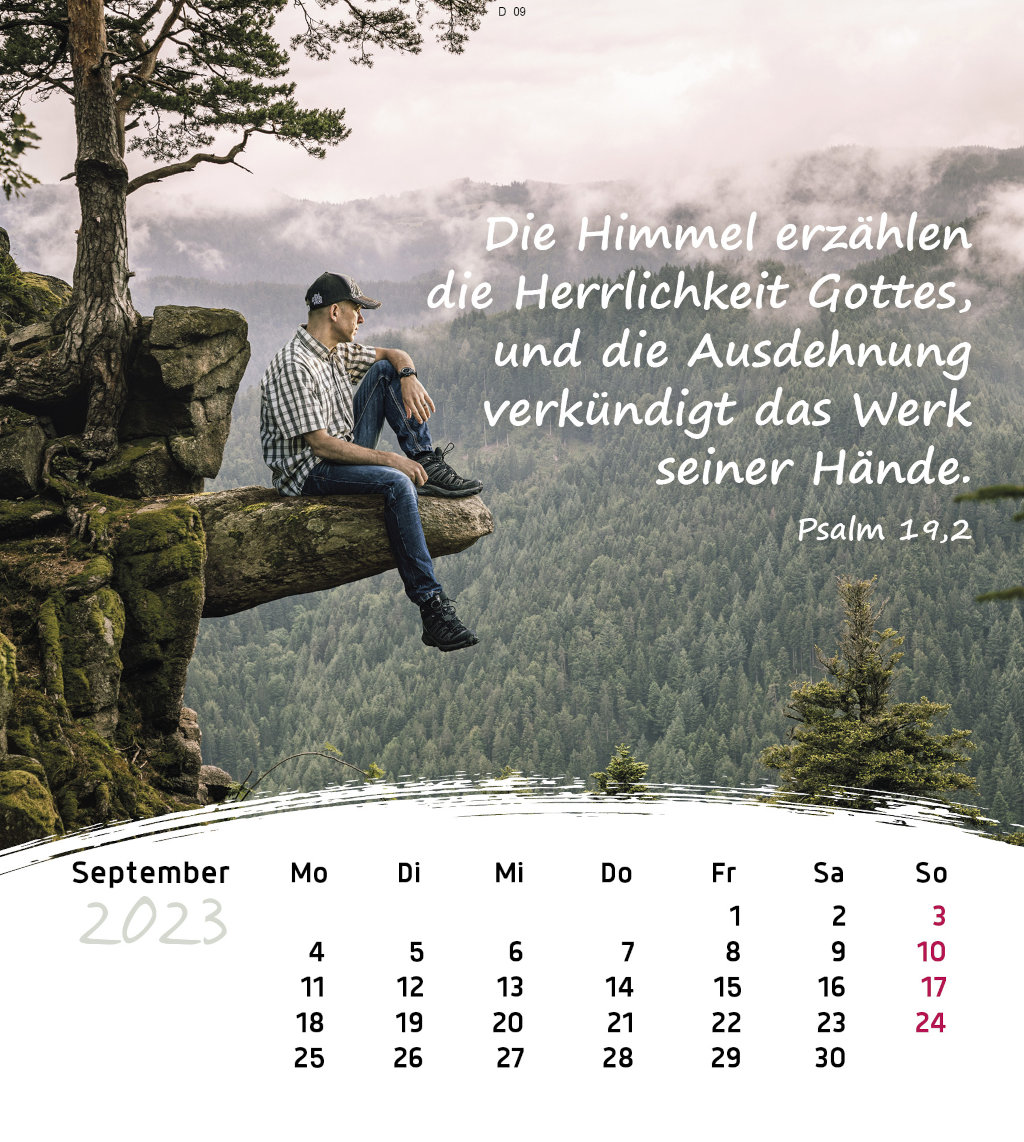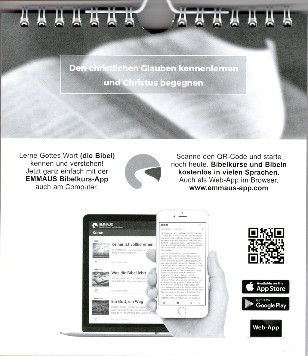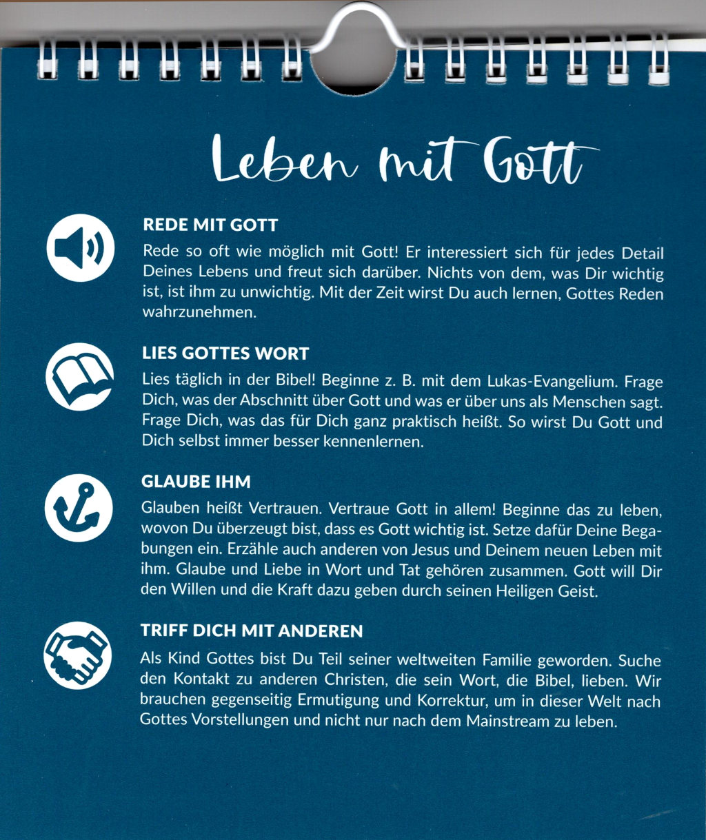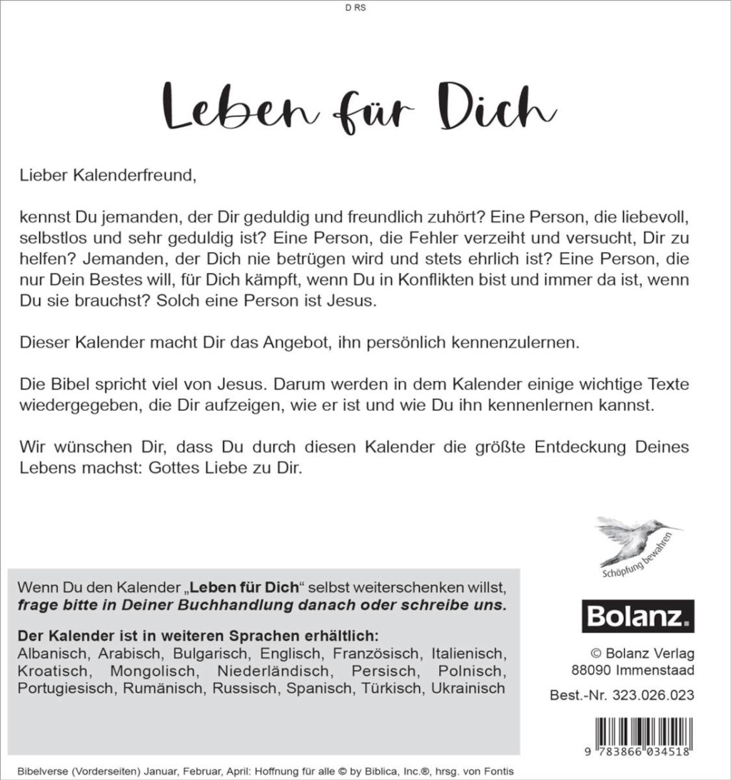 Der Postkartenkalender Leben für Dich 2023 in Deutsch mit ansprechenden Bildern, passenden Bibelversen und evangelistischen Texten, die auf Jesus Christus und die Erlösung durch ihn hinweisen. Zum Aufstellen oder Aufhängen.