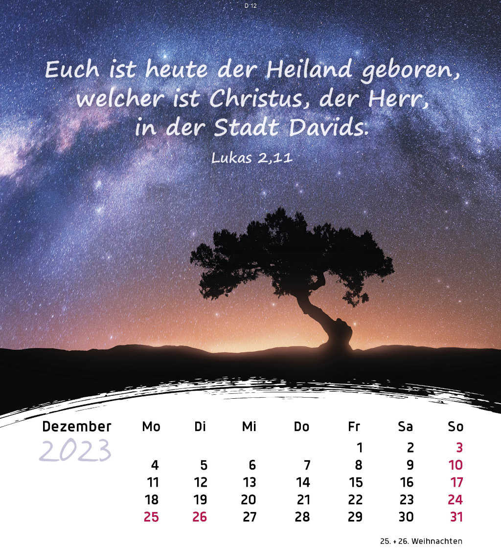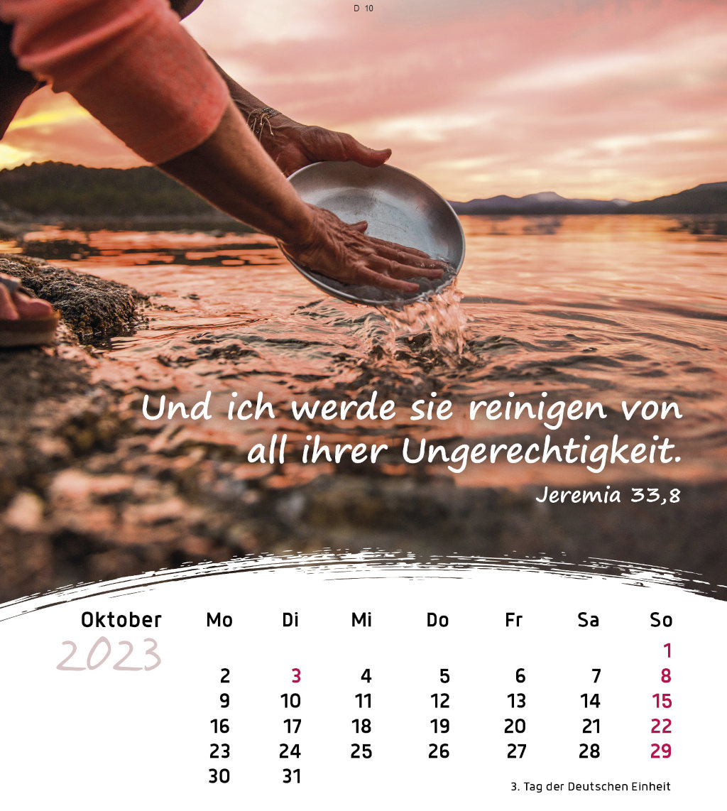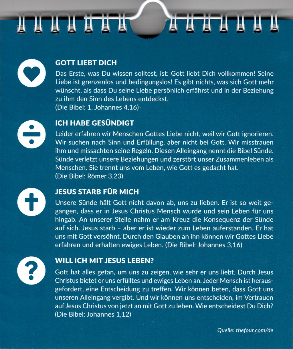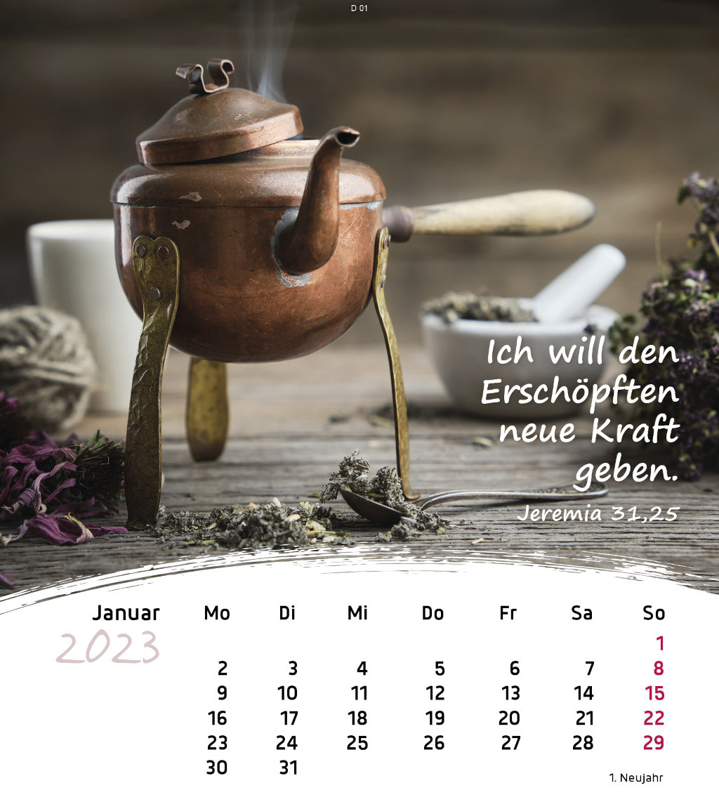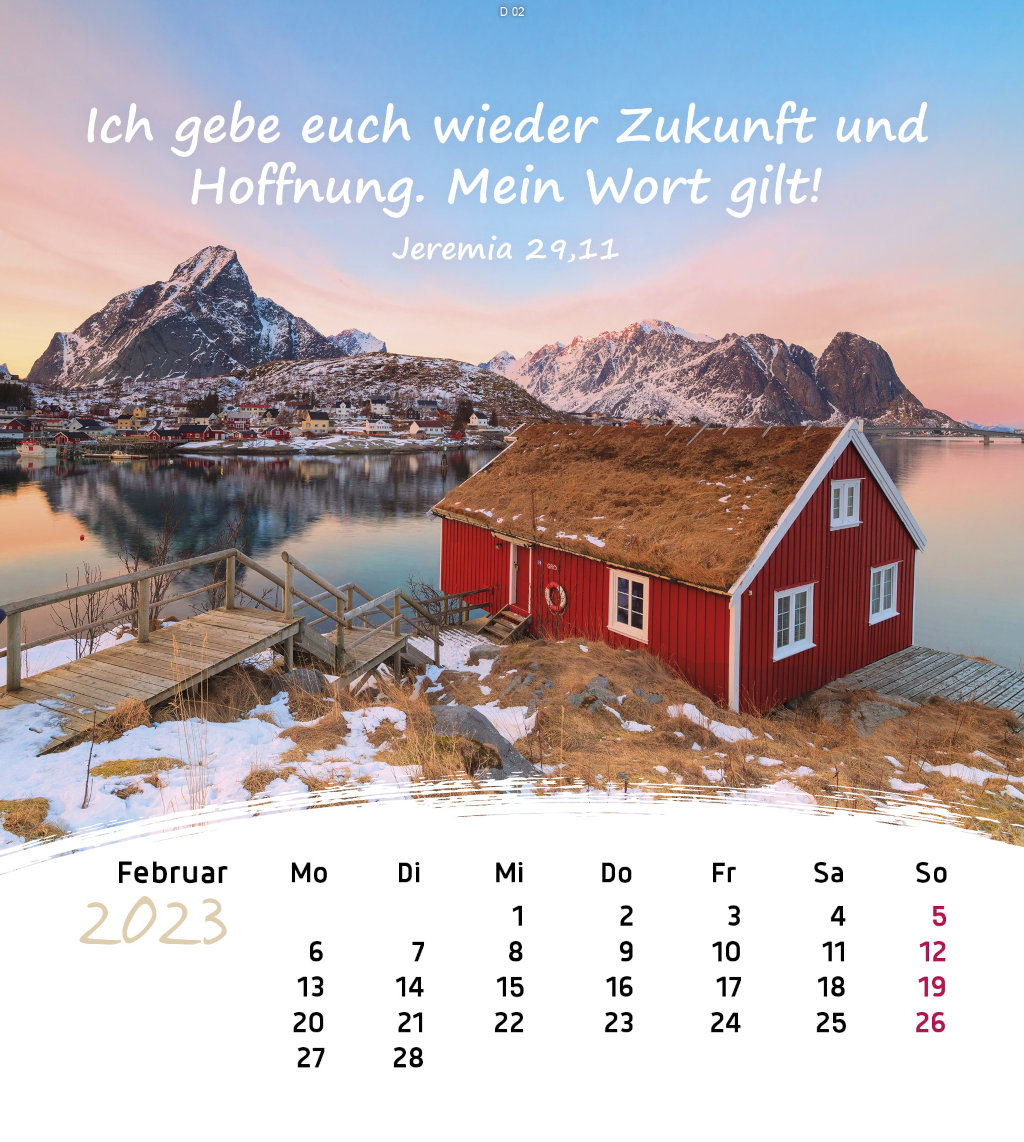 Der Postkartenkalender Leben für Dich 2023 in Deutsch mit ansprechenden Bildern, passenden Bibelversen und evangelistischen Texten, die auf Jesus Christus und die Erlösung durch ihn hinweisen. Zum Aufstellen oder Aufhängen.