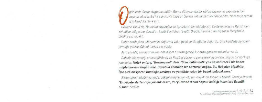 Auf der 1. Innenseite befindet sich die Weihnachtsgeschichte aus dem Evangelium nach Lukas 2, Verse 1- 14. Die rechte Innenseite bietet Platz für einen persönlichen Gruß. Auf der Rückseite steht: Jesus spricht: Ich bin das Licht der Welt. Wer mir nachfolgt, wird das Licht des Lebens haben. Johannes 8,12