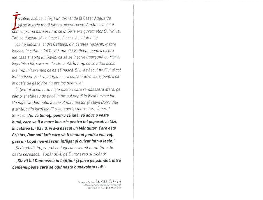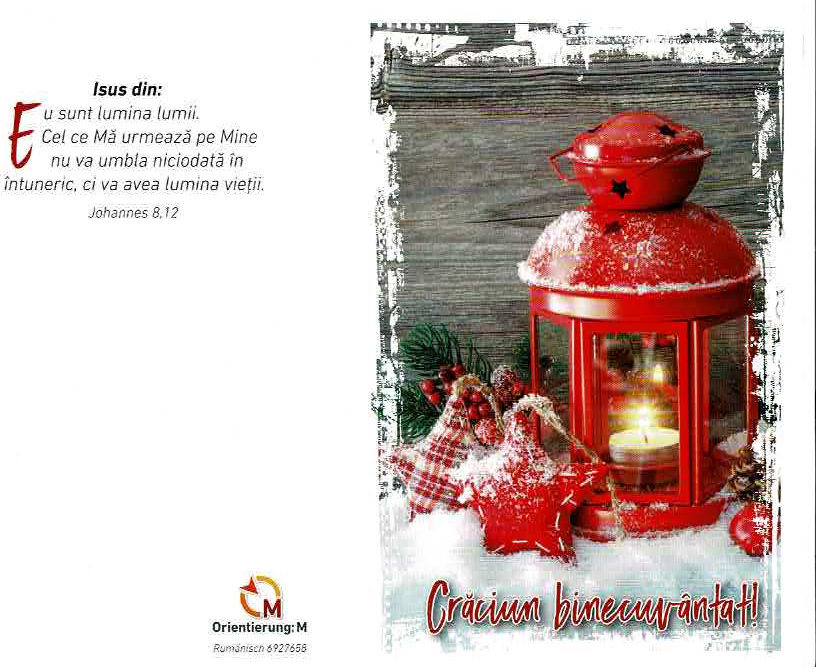 Auf der 1. Innenseite befindet sich die Weihnachtsgeschichte aus dem Evangelium nach Lukas 2, Verse 1- 14. Die rechte Innenseite bietet Platz für einen persönlichen Gruß. Auf der Rückseite steht: Jesus spricht: Ich bin das Licht der Welt. Wer mir nachfolgt, wird das Licht des Lebens haben. Johannes 8,12